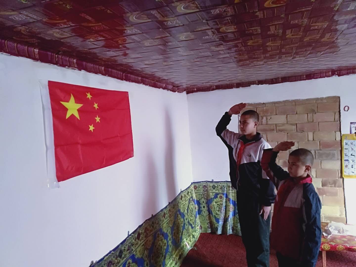五团中学八(3)班艾海江与弟弟在家举行升国旗仪式