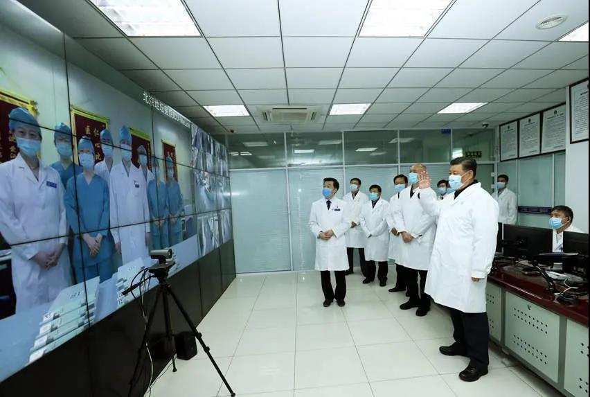 在地坛医院远程诊疗中心,习近平通过视频连线武汉市收治新冠肺炎患者的金银潭医院、协和医院、火神山医院,向疫情防控一线的医务工作者了解情况、听取意见和建议。