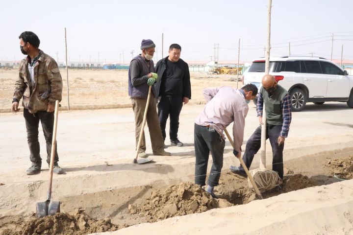 二二五团项目指挥部入驻民航新村以来,积极配合师市及二二五团各项活动。项目指挥部工作人员们分工合作、互相配合,在二二五团民航新村项目指挥部道路两侧种下了60余棵杨树。