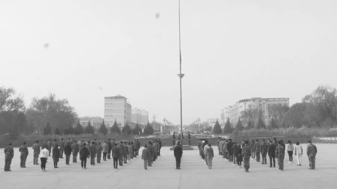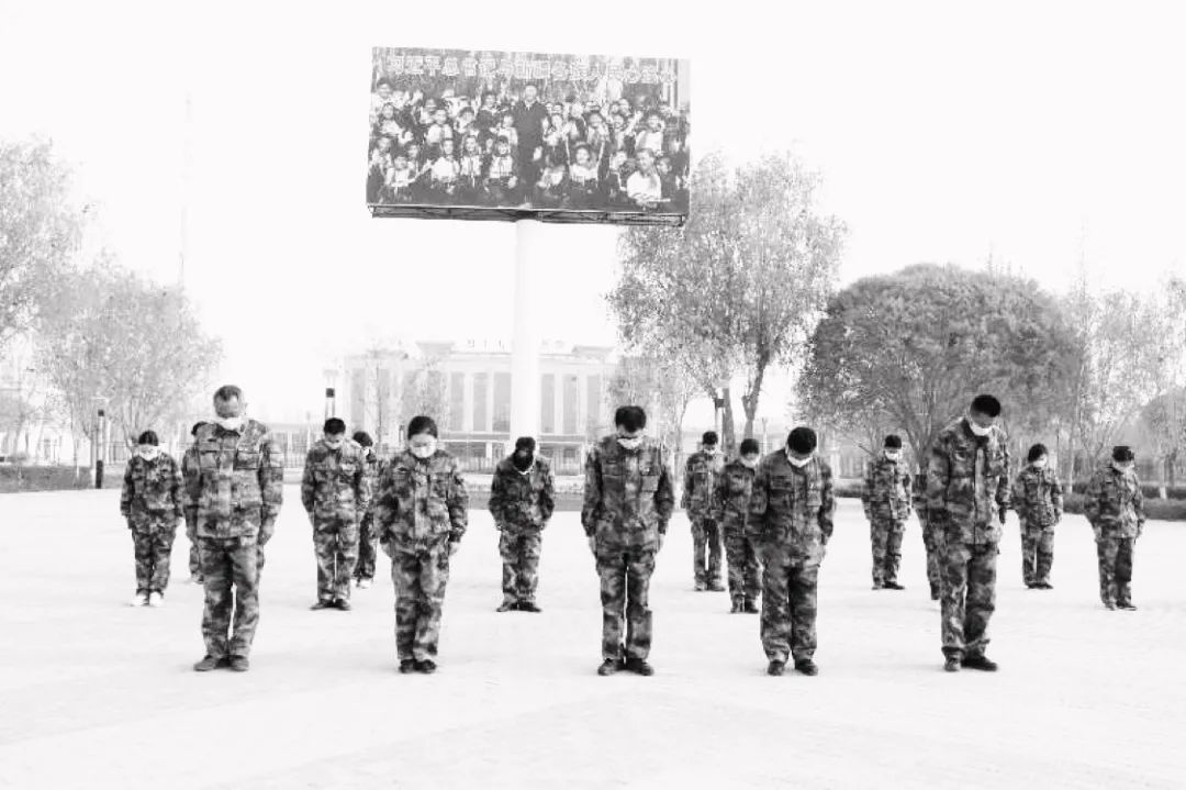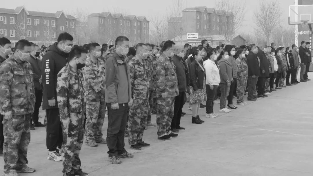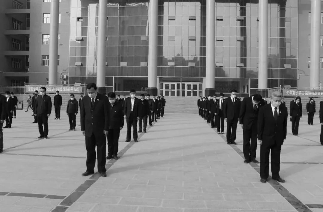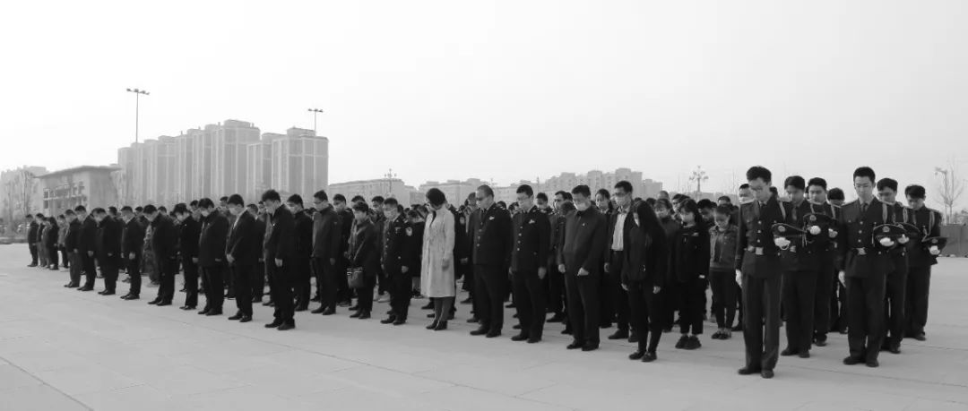 10时,防空警报鸣响,师市机关全体人员面向国旗庄严肃立,低头默哀3分钟。