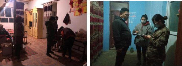 图为爱卫办工作人员和村干部对村民家庭卫生检查登记