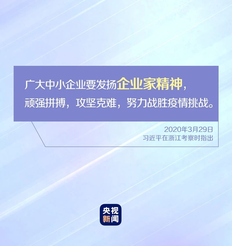习近平强调,广大中小企业要发扬企业家精神,顽强拼搏,攻坚克难,努力战胜疫情挑战。他再次把“干在实处、走在前列、勇立潮头”送给浙江人民,这也是总书记对全国人民的殷殷嘱托。