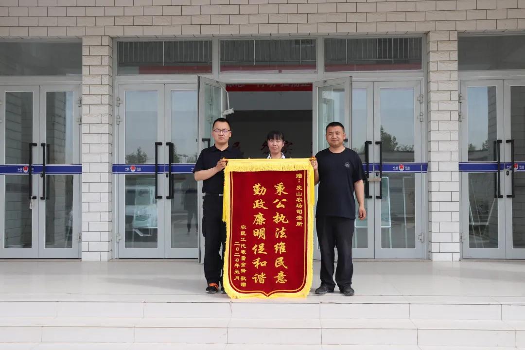 5月13日下午,雷某的妻子来到皮山农场司法所,亲手将一面书有“秉公执法维民意、勤政廉明促和谐”的鲜红锦旗送到皮山农场司法所,对皮山农场司法所有效解决他们的矛盾纠纷表示感谢。