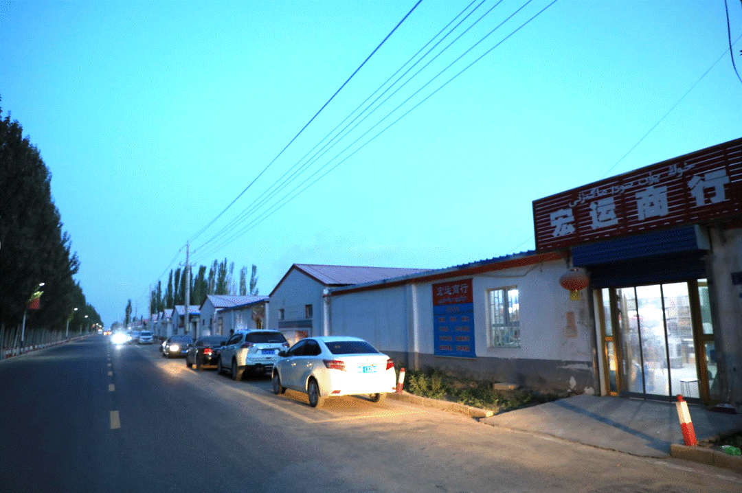 盛夏的二二五团,瓜果飘香、水清树绿,在喀孜纳克村入口处从315国道往南行驶5公里,穿过一片枣园,首先映入眼帘的是一排整齐的平房商铺。傍晚时分,店铺的招牌灯亮起,这条长一公里的商业街开始热闹了起来,街道边停满了车辆,餐馆、商店里人来人往。