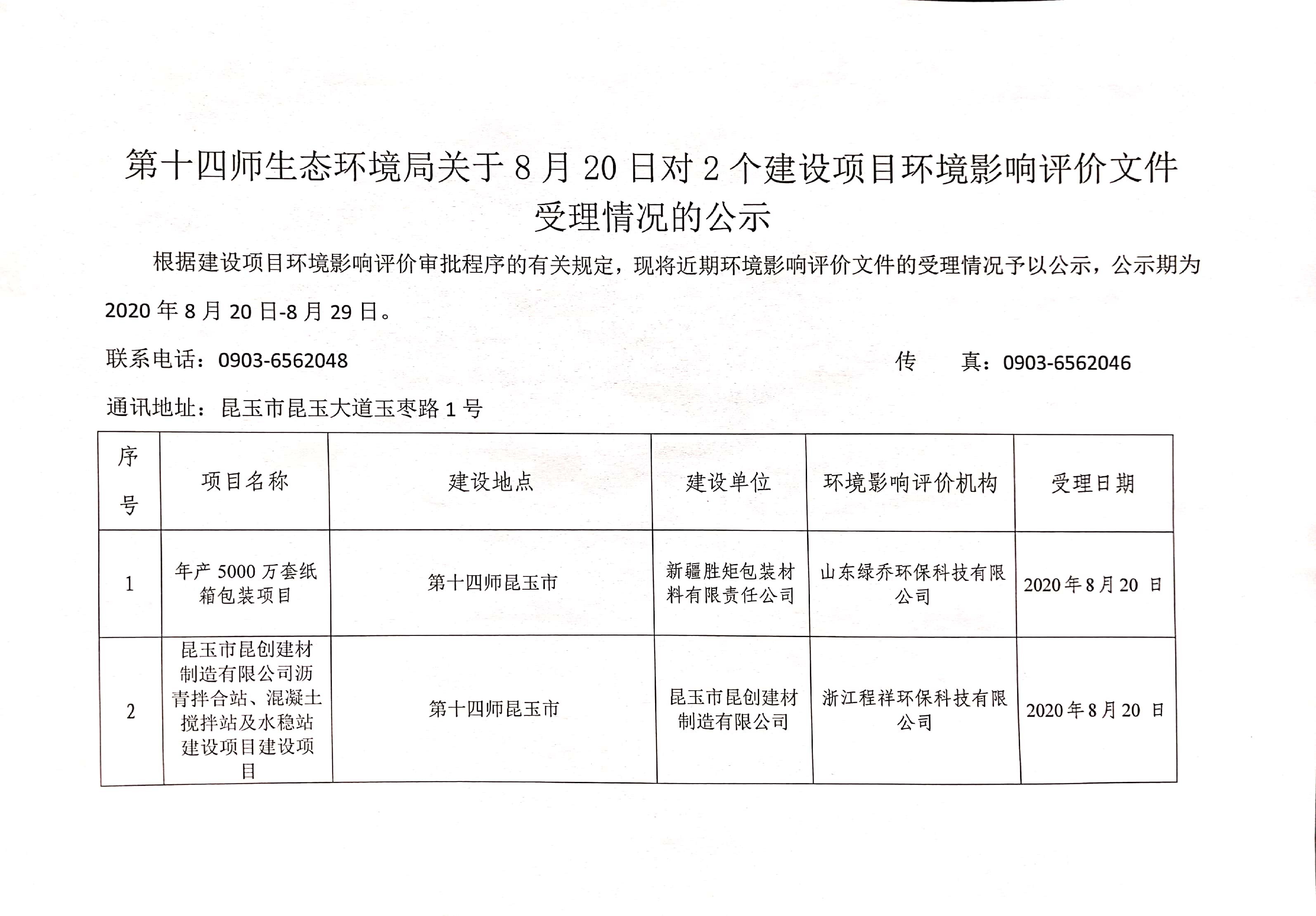 第十四师生态环境局关于8月20日对2个建设项目环境影响评价文件受理情况的公示