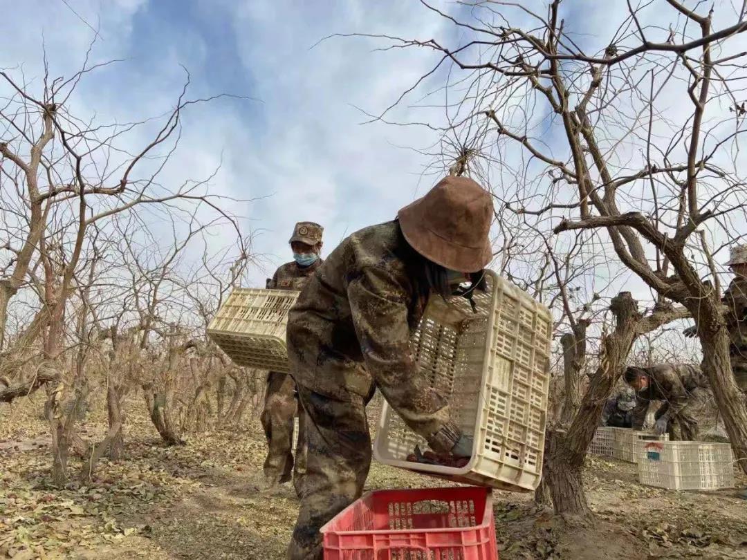 11月14日,二二四团机关组织87名工作人员义务帮助二连困难老党员李彦超采收红枣。