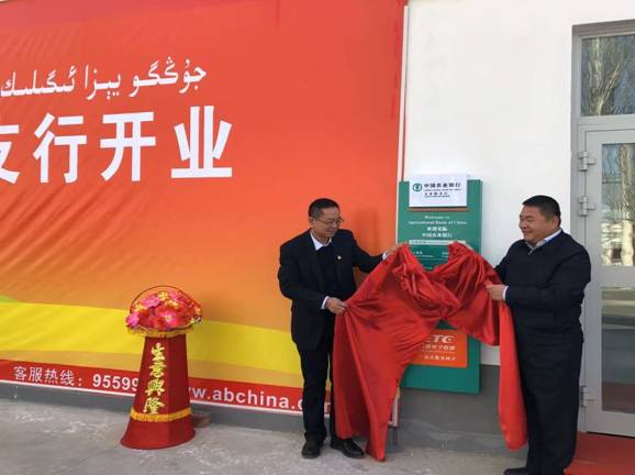 第十四师二二五团党委书记、政委武杰与中国农业银行和田分行党委书记、行长李亚军为中国农业银行玉泉镇支行揭牌。