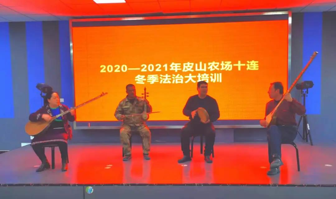 十连4名职工将传统乐器与经典红歌相结合,一边弹奏曲调,一边高唱红歌,整个舞台都被他们热情洋溢的歌曲所感染。参加培训全体人员纷纷上台,在指挥员的引领下一起合唱,唱出了十连职工听党话、感党恩、跟党走的坚定信念。参训职工还通过自编自导自演小品,情景剧等多种形式开展文化活动,增强连队凝聚力,使职工群众对法治培训的内容产生了浓浓的兴趣。