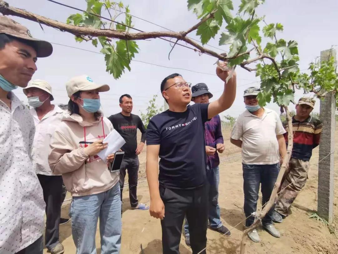 会上,新疆农垦科学院葡萄研究所专家老师讲述葡萄“厂”字型的技术特点,对前一阶段工作中存在的问题进行了纠正,并结合葡萄长势现状讲解近期葡萄现阶段生育节点所需要掌握的相关技术和需要开展的农事活动,并与职工群众开展互动,解答群众问题,争取让职工群众能够真正掌握技术要领,提高农业科技水平。