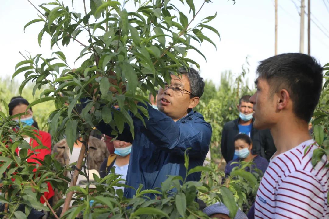 眼下,正是果园管理的关键环节,为进一步扩宽果农视野,提高果树管理能力。5月19日,北京市平谷区农业农村局副局长史长利一行受邀赴二二五团果树种植基地组织农业服务中心干部、果农代表共100余人开展桃树梳果管理与整形修剪技术培训会。