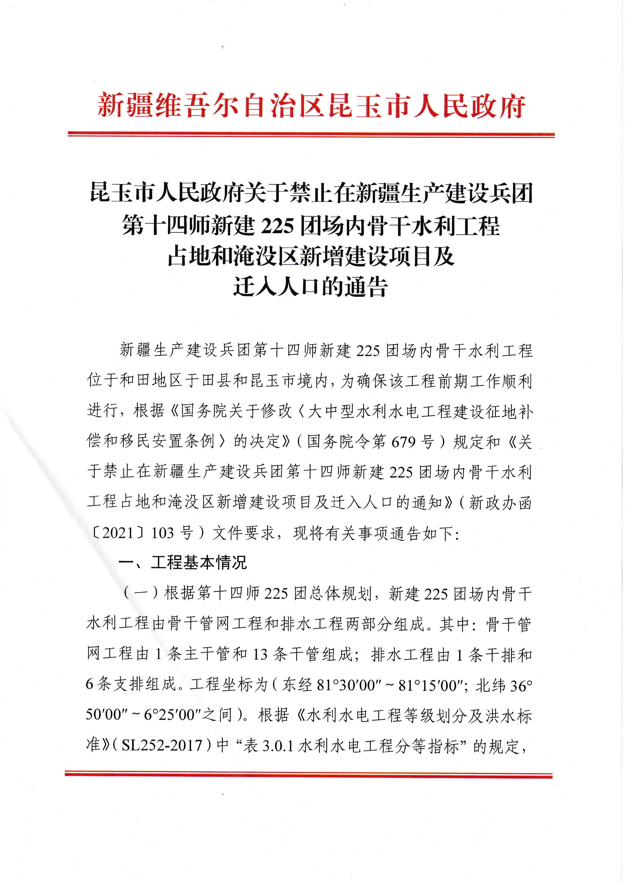 昆玉市人民政府关于禁止在新疆生产建设兵团第十四师新建225团场内骨干水利工程占地和淹没区新增建设项目及迁入人口的通告