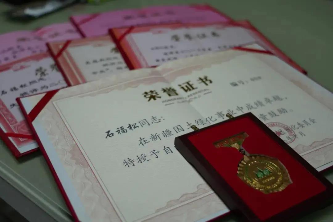 石福松有厚厚一摞荣誉证书,二二四团“优秀共产党员”、“先进生产者”“民兵工作先进个人”等等,2019年,他还获得新疆维吾尔自治区“绿化奖章”,但是他始终觉得自己做的还不够。他说:“今年,通过党史学习教育,让我明白了一个道理,入党不是为了享受,而是为了更好地做出贡献,在今后的日子里,我会继续发扬吃苦耐劳的精神,最大限度发挥一名共产党员的模范引领作用,发挥自己多年的护林经验,和大家一起守护团场的金山银山。”
