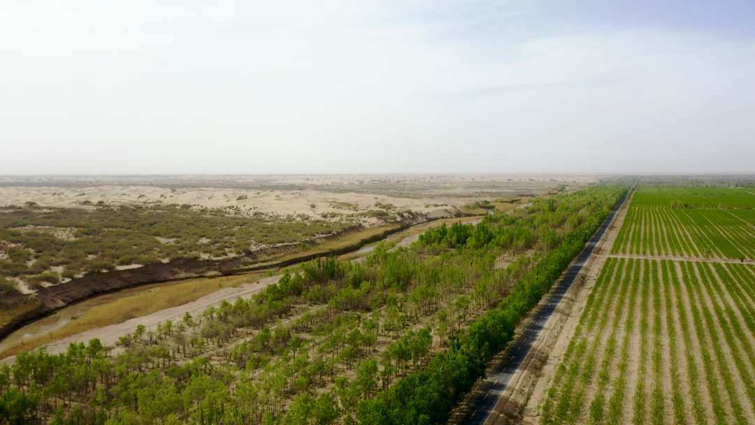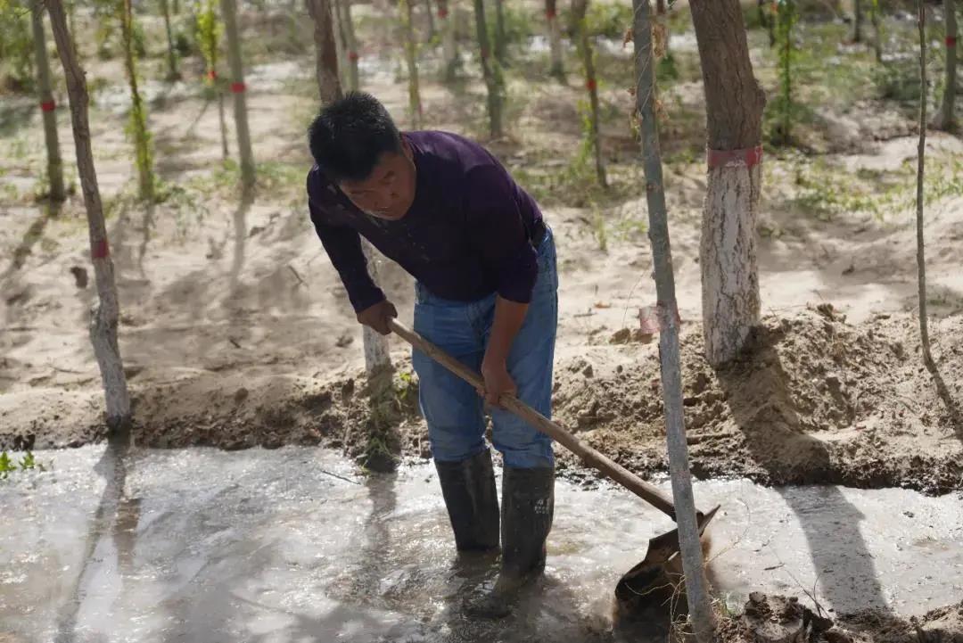 石福松负责的林区有1800多亩,林带面积大,养护责任重。在沙漠里想要把树养好,浇水很重要,他说:“以前是滴灌浇水,现在改成漫灌了,很多地形不平整,想要把每棵树都浇上水就得把地先平整好。”