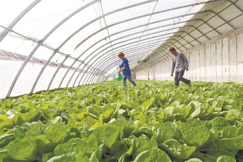 二二五团民航新村村民在农业种植基地大棚里管理蔬菜(摄于4月12日)。兵团日报常驻记者 刘秋月 摄
