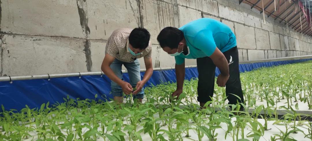 (合作社工作人员正在观察水培菜的生长情况)