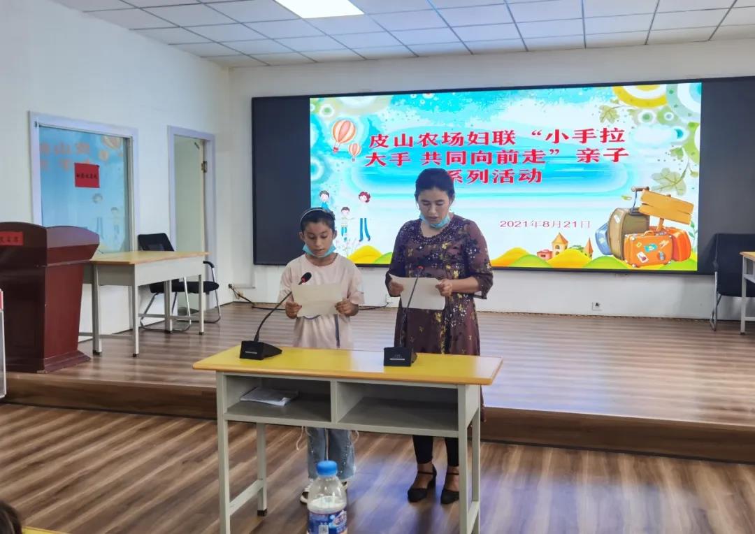 (8月21日下午,皮山农场妇联在进步路社区会议室开展“小手拉大手 共同向前走”亲子系列活动。)