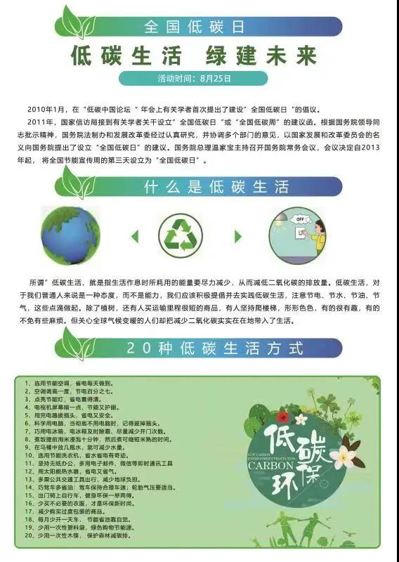 今年8月23日至8月29日是第31个全国节能宣传周,主题为“节能降碳,绿色发展”。8月25日是全国低碳日,主题是“低碳生活,绿建未来”。师市机关各单位围绕节能宣传周和低碳日主题,积极开展节能减排各类宣传活动,倡导节能低碳的生活方式、消费模式和生活习惯,动员广大干部群众以实际行动做节能减排的实践者、示范者、传播者。