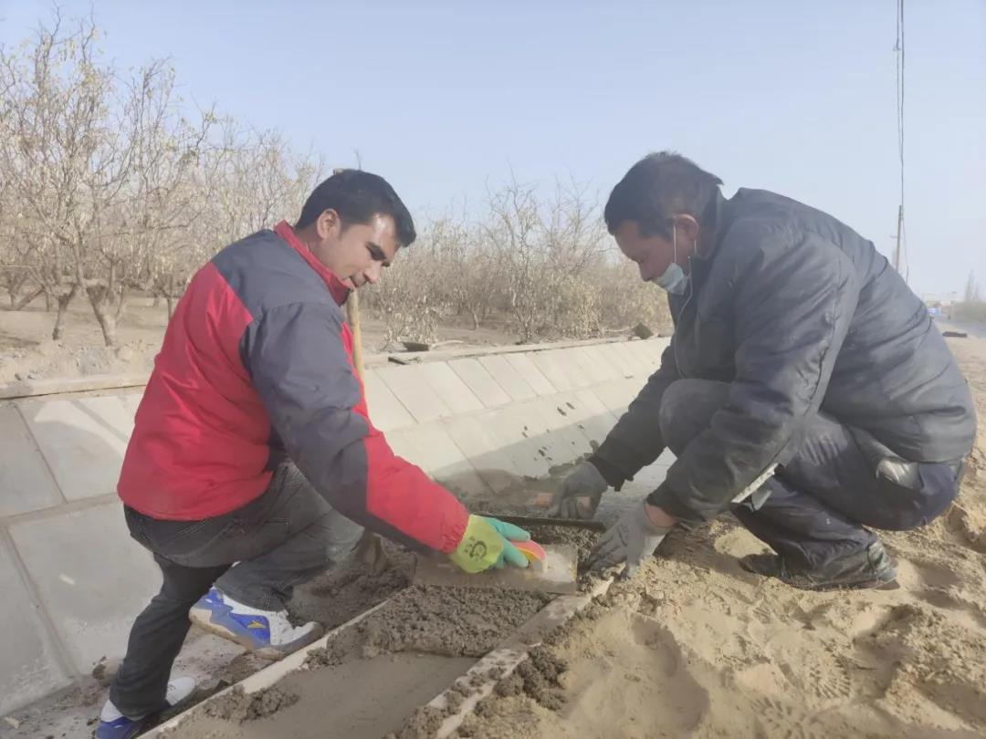 11月13日记者来到皮山农场一连新改建的防渗水渠边,工人们正在水渠道边进行水泥封边作业,项目已进入最后收的尾阶段。