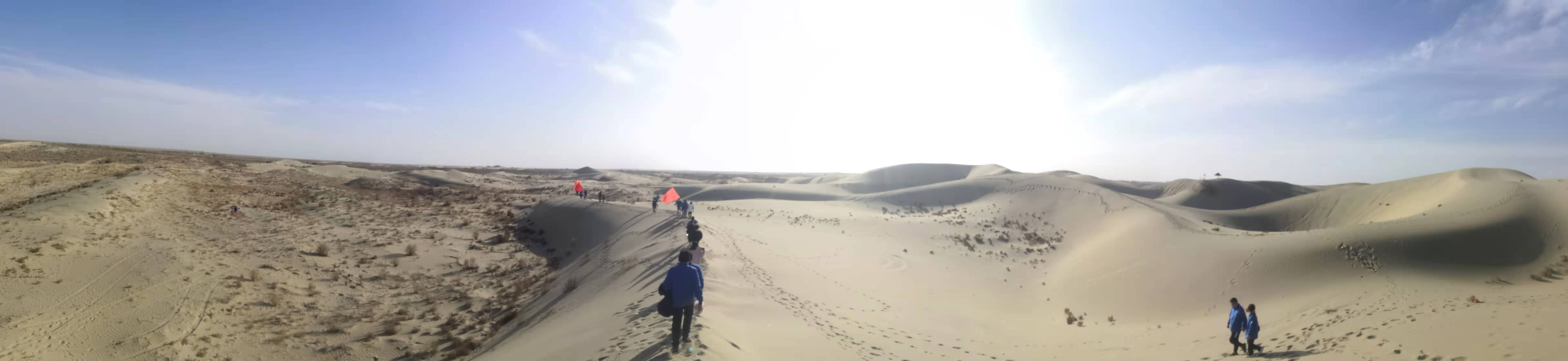 当天下午,志愿者们来到老兵驿站,重走老兵路。黄沙漫漫,红旗飘飘。在中国共产党党旗指引下,志愿者们一路向前,无一人掉队,无一人退出,顺利抵达沙漠坡顶。随后,志愿者们兵分两路,分别去拜访援疆山东女兵岳春香老人和邢桂英老人。尽管邢桂英老人已经卧床不起,但依然十分精神,她还清楚地记得自己的入党日期,还记得为了早日建成大美新疆,当年不分日夜的劳动,还记得起早贪黑的种树,没有时间照料孩子,只得把孩子托付给托儿所照料……虽然不复年轻,眼睛也早已看不太清,但志愿者却能够从老人的讲话和神情中看到当年的那个意气风发支援新疆的梳着两个高高的麻花辫的山东昌乐姑娘。有道是黄沙载志,足印他乡,任西风烈,戍边防,大爱无疆,情怀满月,他乡故乡,山河壮,字无章。