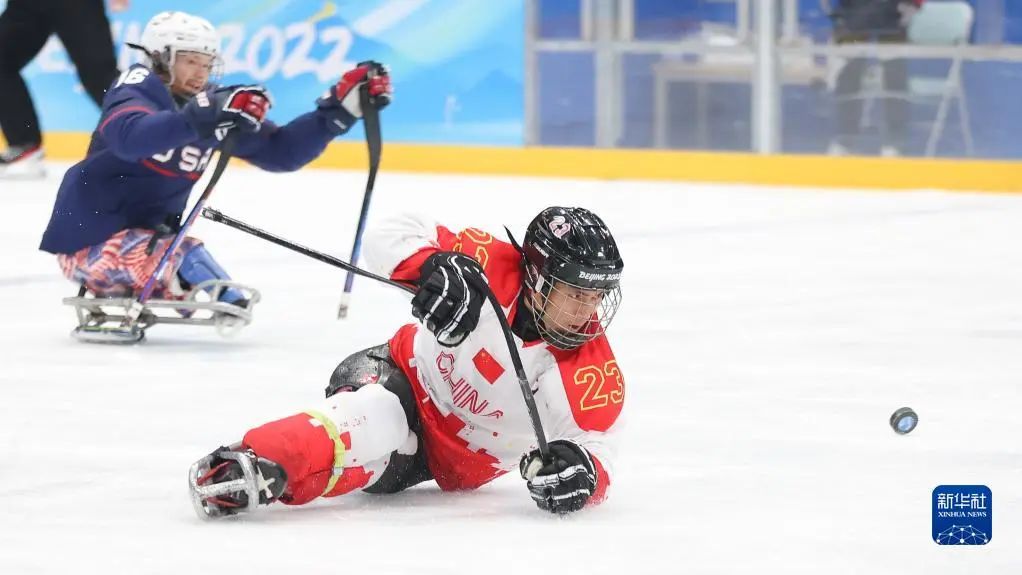 3月11日,在北京国家体育馆,中国队球员崔玉涛(右)在北京2022年冬残奥会残奥冰球半决赛中。新华社记者 马希平 摄