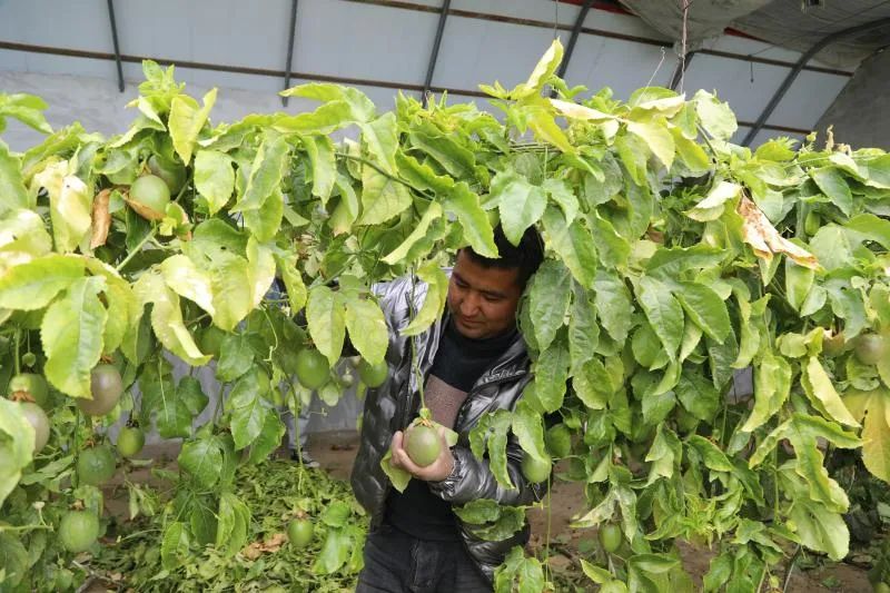 二二五团四连的图尔荪江·麦米提热依木是当地有名的大棚种植户,百香果、火龙果就是他的大棚里种出来的。 周末,于田县及周边乡镇的人陆续来到大棚里观光游览,体验采摘乐趣。