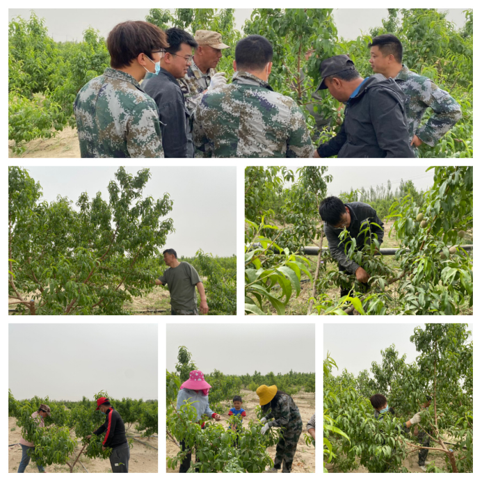 四连党支部书记、指导员赵小良说:“正值桃子疏果季节,为提升果品质量,四连所有干部深入田间地头,包户到人,指导群众抓紧时间进行疏果工作,连队干部实地查看群众的疏果情况,并亲自示范疏果方式,对桃树进行疏果。同时,通过耐心细致地讲解,让群众明白疏果提升了桃子果品档次,大大提高了桃子的经济效益。”