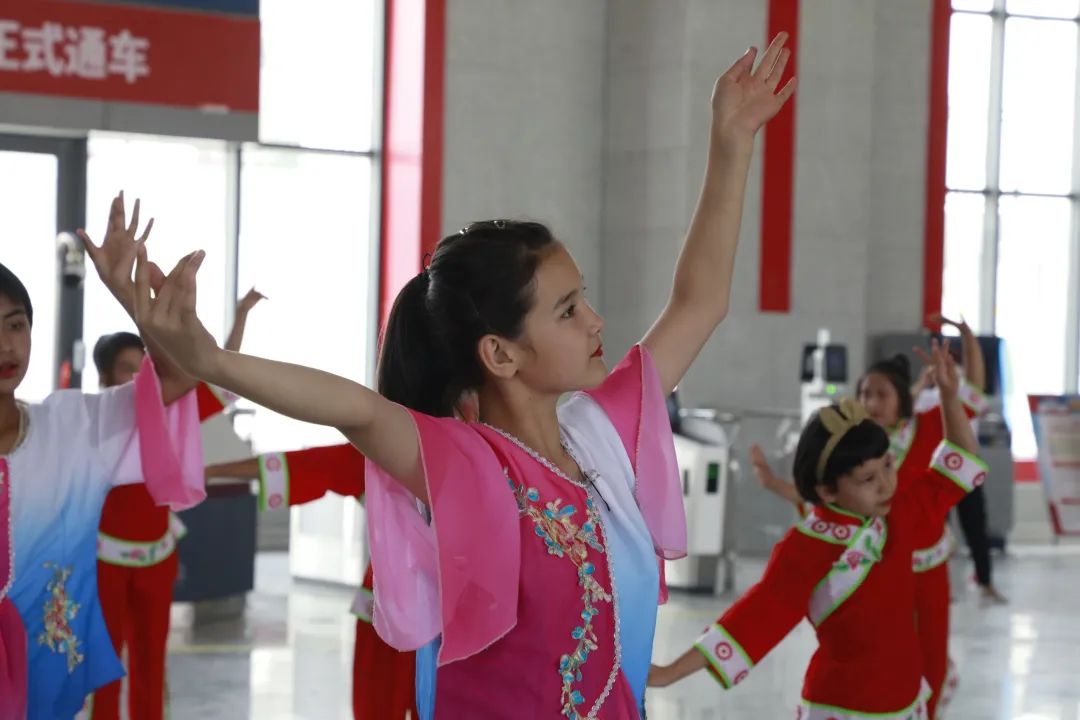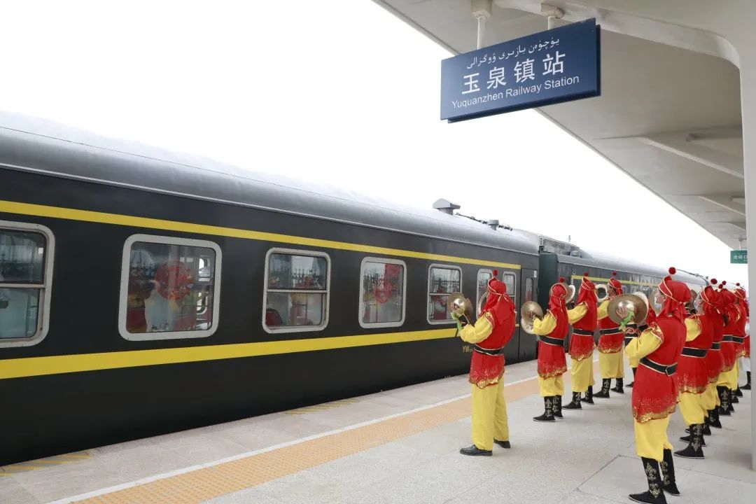 当天,还举办了庆祝玉泉镇火车站正式通车活动。人们敲起锣鼓、弹起冬不拉、跳起麦西莱普,载歌载舞欢庆玉泉镇火车站通车。