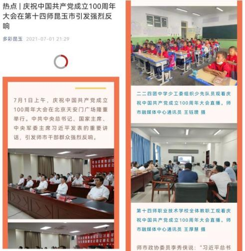 各媒体平台开设《庆祝中国共产党成立100周年》《向成立100周年献礼》《奋斗百年路 启航新征程》《庆祝中国共产党成立100周年优秀广播剧展播》《庆祝成立100周年优秀党员教育电视片展播》等栏目。特别策划推出《学习“七一”讲话精神、助力师市高质量发展》系列报道,圆满完成中央庆祝中国共产党成立100周年大会、“七一勋章”颁授仪式、中央庆祝中国共产党成立100周年文艺晚会等重大活动的直播转播任务,保障广大职工群众观看体验,动员全体干部职工群众共同庆祝中国共产党百年华诞。