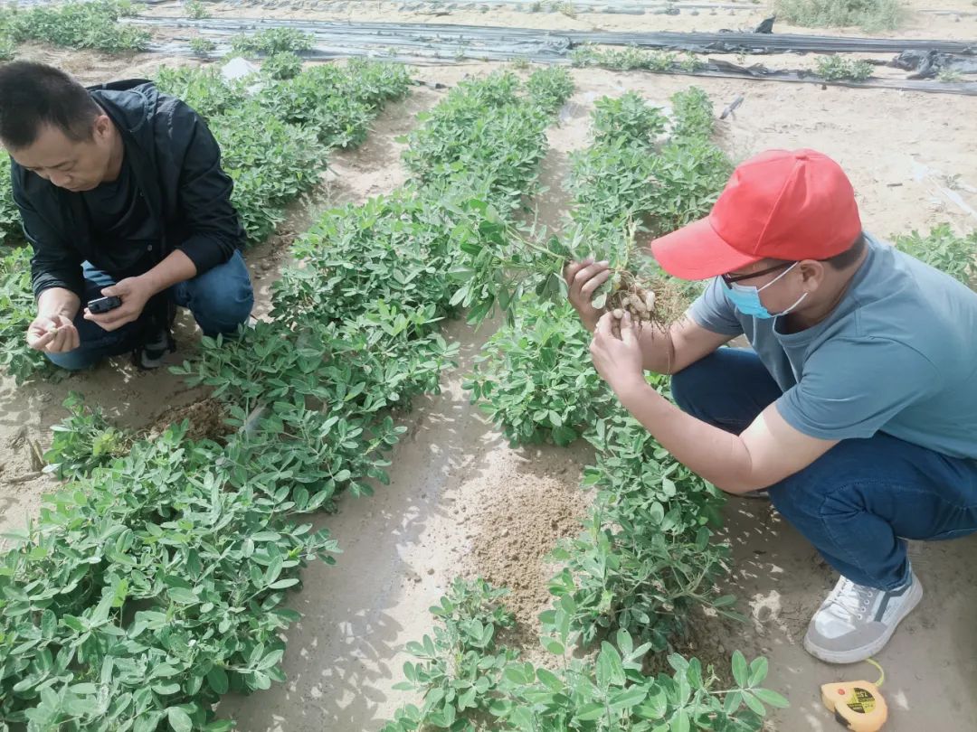 在两万亩地,团农发中心人员和一连的“两委”、种植户分两组开始测产工作。“你看,现在结的荚果都是双仁果或多仁果,果实大而饱满。”种植户邵鹏说:“今年的花生是我们第一年试种,看着今年的长势很喜人,没想到两万亩地的土质可以种出这么好的花生。”