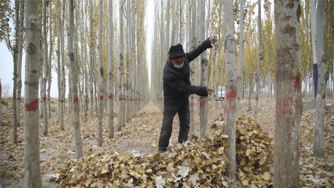 养殖户收集防护林下的树叶。师市融媒体中心通讯员 江宇 摄