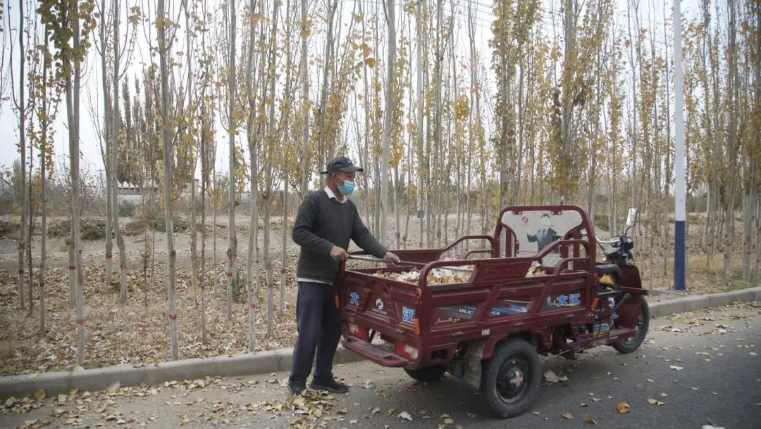 麦提库尔班·买提努热将树叶装入三轮车。师市融媒体中心通讯员 江宇 摄