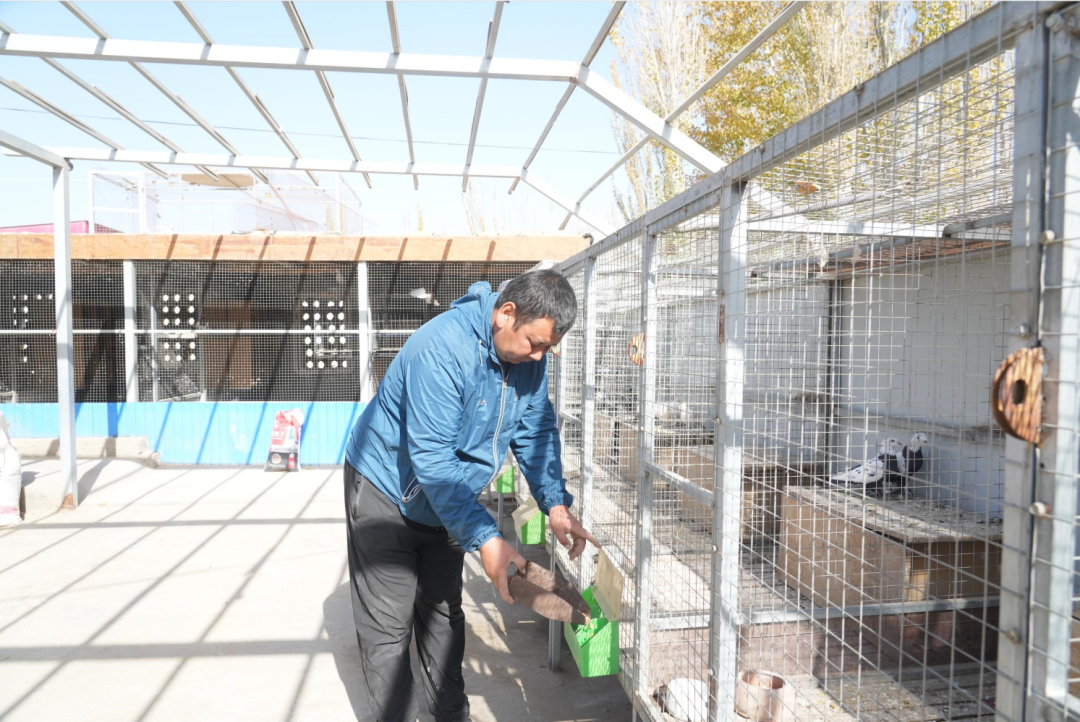 依穆兰·艾科热木给鸽子喂食。师市融媒体中心通讯员 赵春 摄