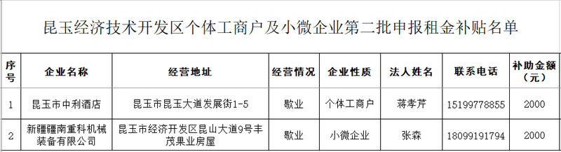 附件:昆玉经济技术开发区个体工商户及小微企业第二批申报租金补贴名单