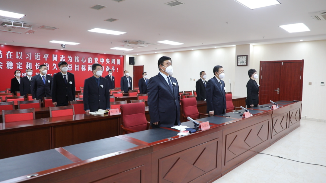 图片师市领导蒋欣、郑敏、王建军等胸佩白花、默然肃立,怀着十分沉痛的心情,集中收听收看追悼大会。师市融媒体中心通讯员 王祯棋 摄