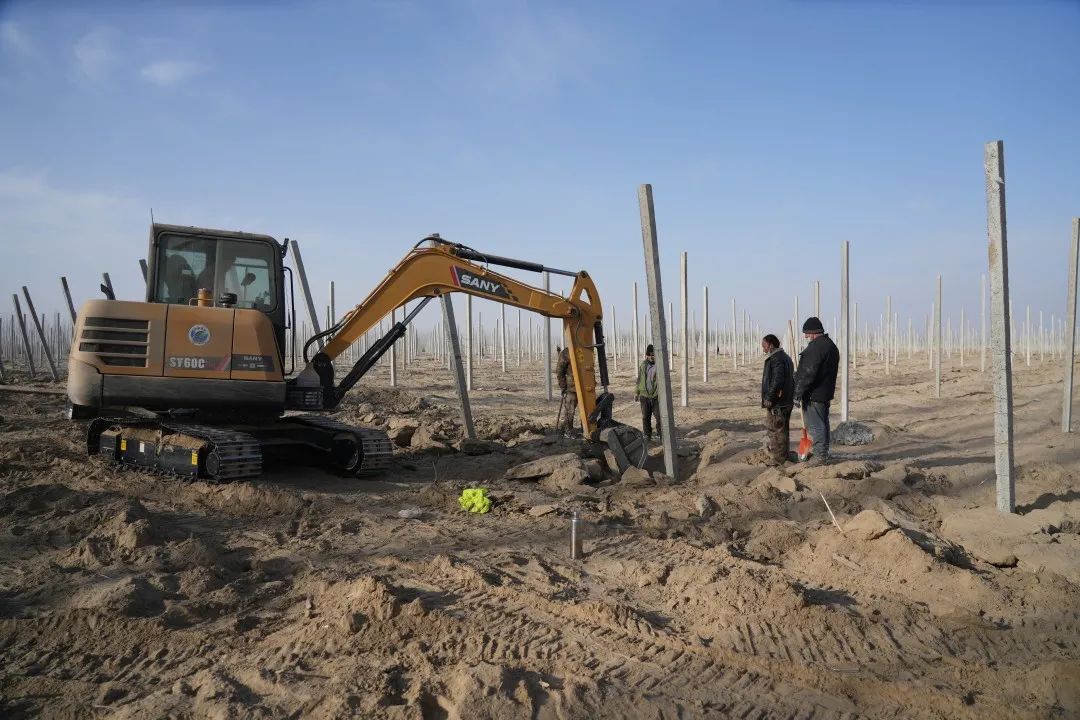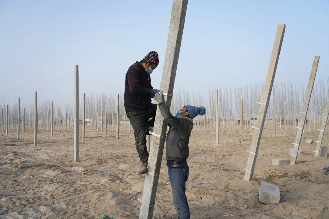 走进二二五团特色苹果精品园示范项目施工现场,工人们在项目负责人的指挥下,紧密配合,有序进行挖坑、埋水泥桩、拉铁丝网等格架系统安装有关工作,忙得热火朝天。