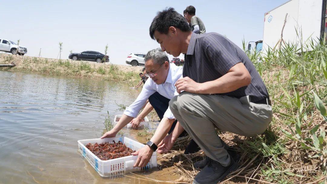 二二四团党委副书记、团长郭建功,刘平到场指导虾苗投放工作。(文体广电服务中心记者 张曌静)