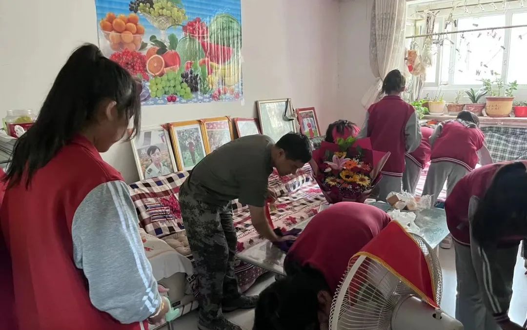 随后,退役军人志愿服务队带领师生来到退役军人、老党员王连宇家中开展志愿服务,并听取他的入党故事和当兵经历。王连宇说:“你们是祖国的花朵,要好好学习,感党恩、听党话、跟党走,长大用自己的本领报效祖国。退役军人们更是要发挥退役不褪色,退伍不退志的精神,为师市发展贡献力量。”