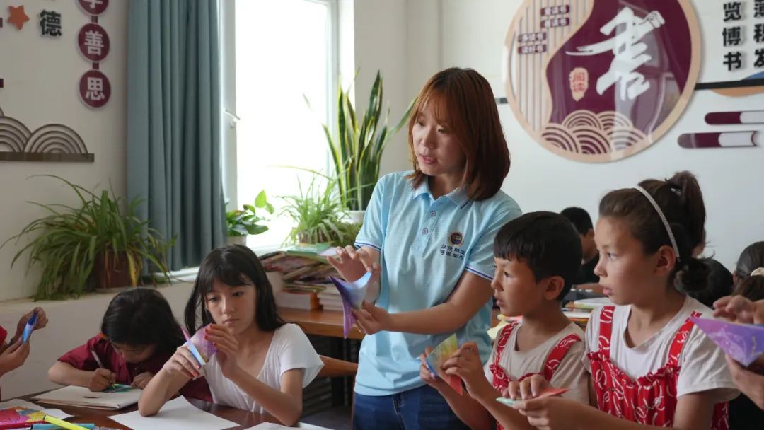 石河子大学三下乡师生为小朋友讲解折纸技巧 唐科文 摄