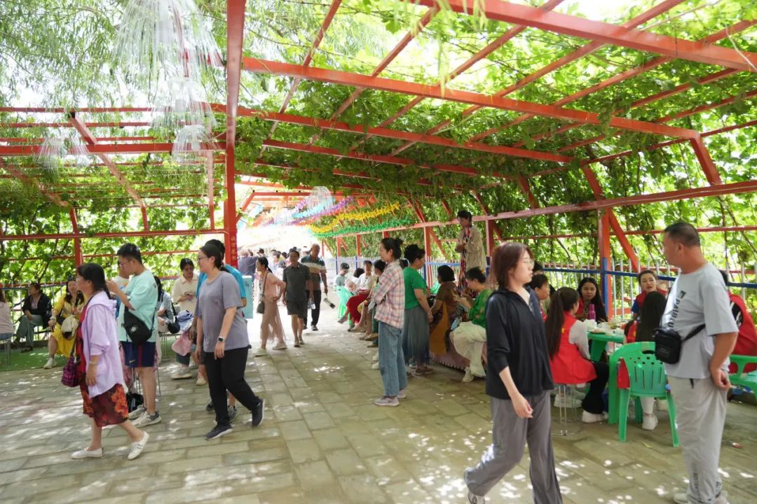湖北武汉游客杨春惠说:“我是从武汉过来的,因为我想要到新疆玩儿,然后打听到铁路旅行比较方便,我通过12306的官方网站找到了这个平台,开启了愉快的新疆之旅,今天已经是我旅行的第五天了这一路就感觉很愉快。今天中午,我们来到桃花源吃饭,这个农庄的环境很好,然后大家一起席地而坐,尝试这种本地人坐在地毯上吃饭的那种感觉,这是我第一次体验感觉很新鲜,他们给我们提供了当地很地道的那种酸奶,再加上手抓饭、烤包子,这些东西我以前都没有吃过,觉得非常好。”