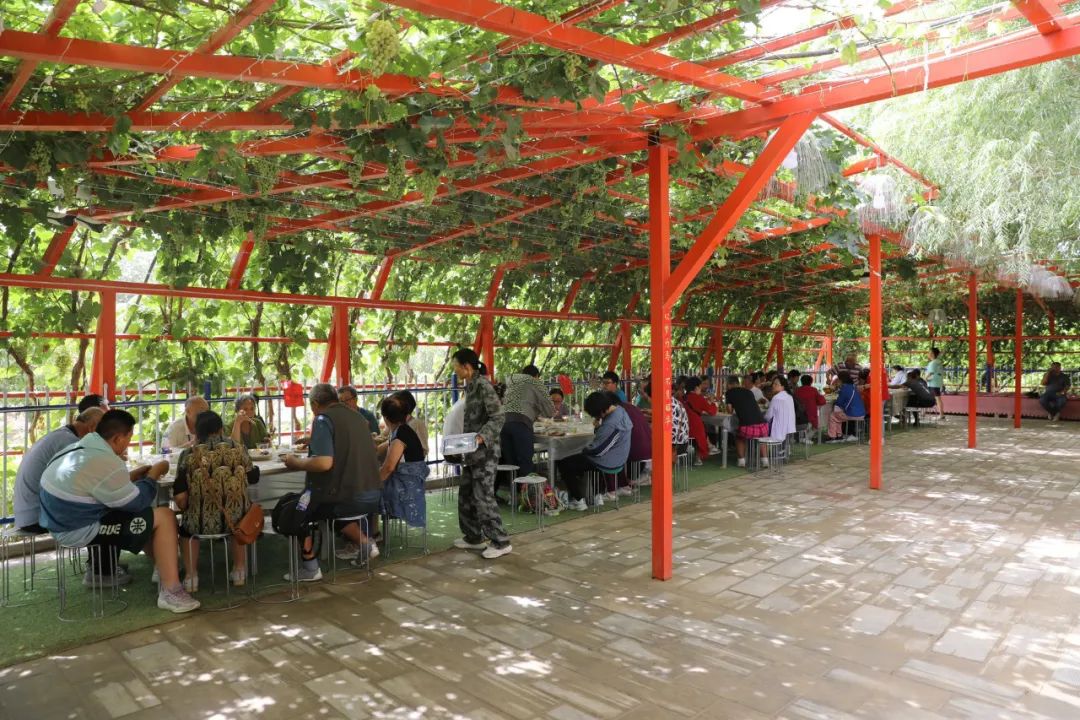 四十七团七连职工吐地买买提·吐达洪说:“我们四十七团七连桃花源农家乐,结合我们现有的条件采摘水果,有橙子、杏子、桃子、葡萄、梨子、苹果,我们的特色菜是牛尾,自己养的鹅、鸡、鸳鸯鸭。我们这儿一次性能容纳400人,旅客吃的还比较满意,目前来说,游客对我们这里的菜,环境比较认可,一年的毛利就是在100万左右。”