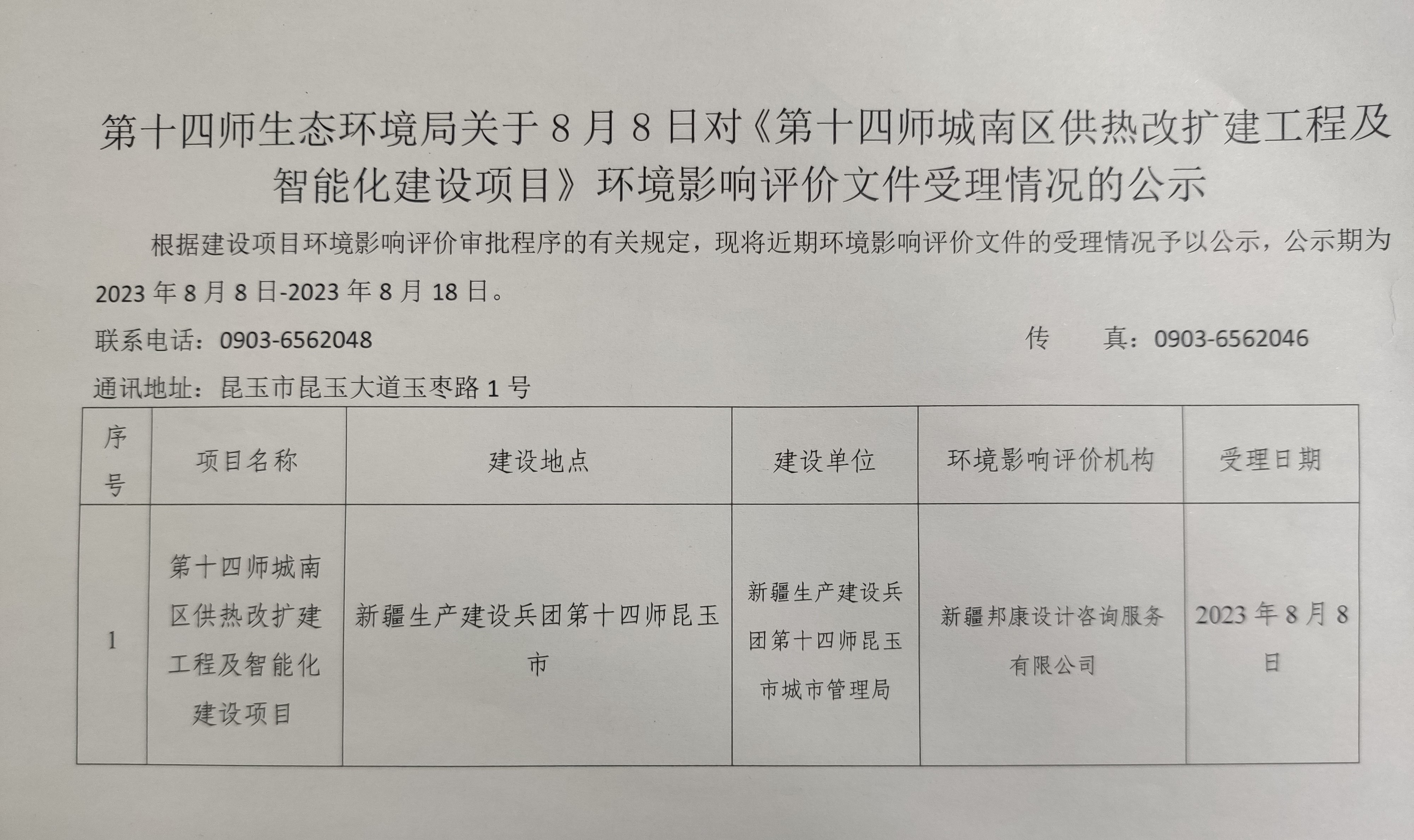 第十四师生态环境局关于8月8日对《第十四师城南区供热改扩建工程及智能化建设项目》环境影响评价文件受理情况的公示