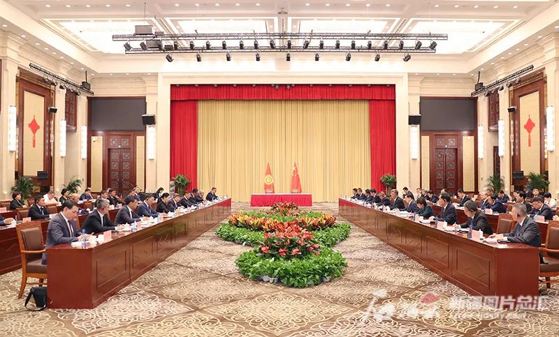 8月16日,自治区党委书记马兴瑞、自治区主席艾尔肯·吐尼亚孜在乌鲁木齐会见来新疆访问并出席2023(中国)亚欧商品贸易博览会的吉尔吉斯斯坦总理阿·扎帕罗夫一行。石榴云/新疆日报记者 崔志坚摄