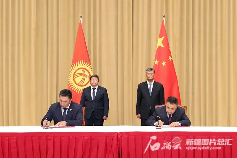 8月16日,自治区党委书记马兴瑞、自治区主席艾尔肯·吐尼亚孜在乌鲁木齐会见来新疆访问并出席2023(中国)亚欧商品贸易博览会的吉尔吉斯斯坦总理阿·扎帕罗夫一行。这是中国新疆维吾尔自治区人民政府与吉尔吉斯斯坦有关部门签署合作协议。石榴云/新疆日报记者 崔志坚摄