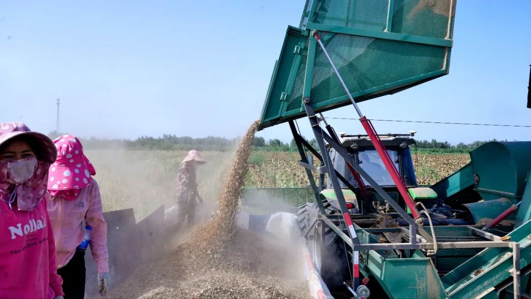 采收方面,孙新胜的葵花地全部采用现代化机械脱盘、筛选、脱粒,极大降低了人工成本。