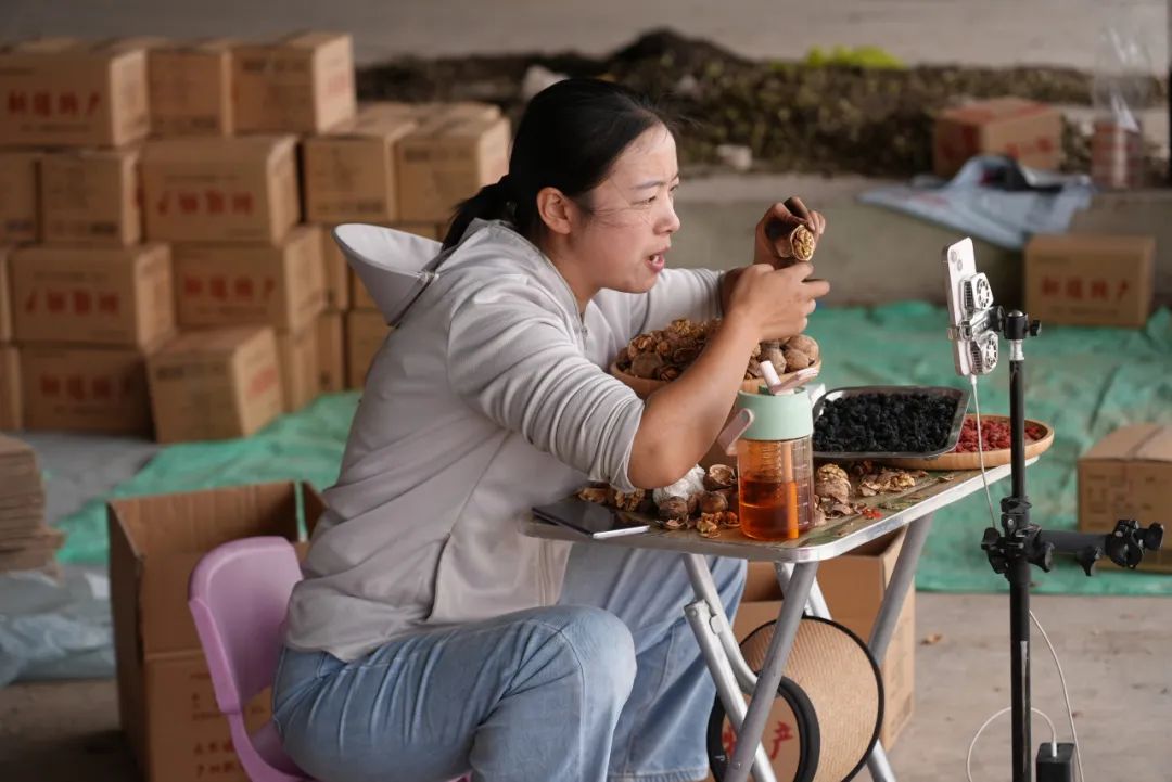 “我和我老公来到这个晒场有一周多了,最好的一场是卖了2000多单。我们发的核桃都是手工剥皮,晾晒四天左右干透后,把那些小的、裂口的、坏的全部都要挑出去,才打包发货,保证质量我们才能吸引更多粉丝。”姬婉雪结束了当日第一场直播后,边和老公打包发货,边对记者说,“没收红枣前,我们还准备卖一些石榴、无花果干。”