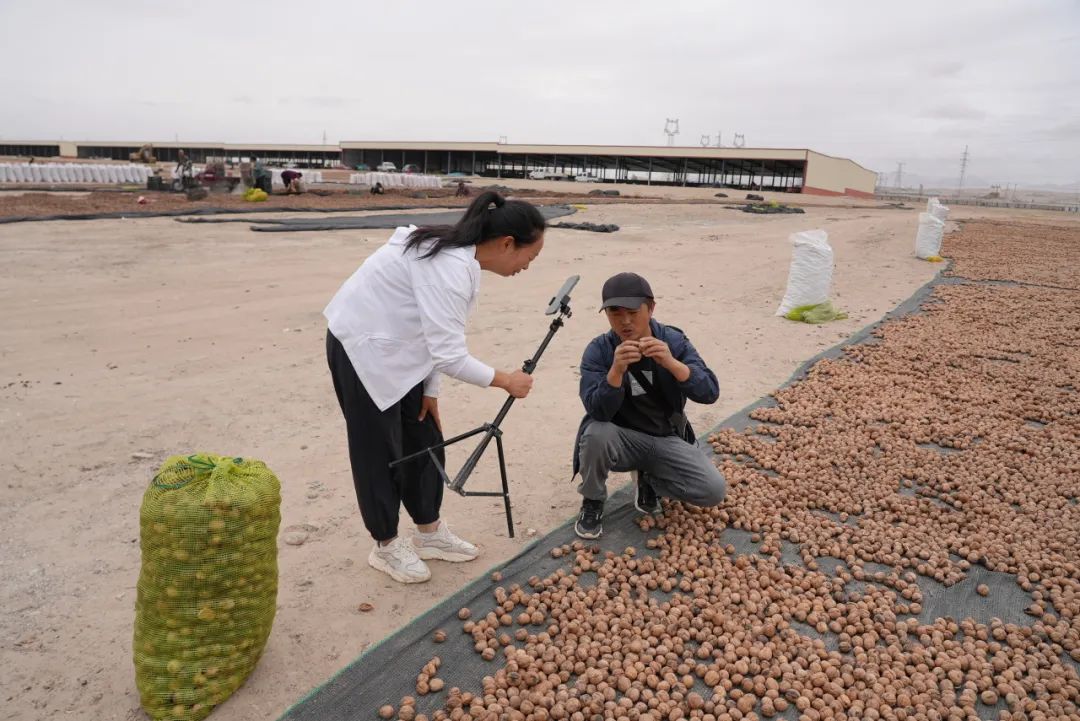 “这里光照时间长、日夜温差大,和田核桃仁白饱满,香气浓郁。大家看,我身后的工人正在给核桃手工去青皮,不加工,不染色,是适合小孩和老人吃的健康绿色干果。”8月27日,位于和田县的农产品交易中心的核桃晾晒场上,第十四师二二四团职工姬婉雪正在直播销售核桃,在她的热情互动和细致讲解下,直播间里不断有人咨询下单。
