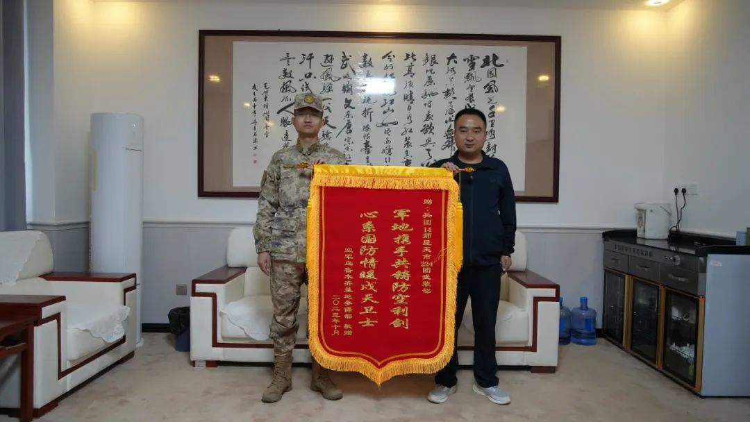 10月13日,空军乌鲁木齐基地参谋部,将写有“军地携手共铸防空利剑 心系国防情暖戍天卫士”“双拥共建奋进强军伟业 鼎力相助彰显鱼水情深”的两面锦旗送到了第十四师二二四团,对二二四团党委对国防和军队建设的高度重视表示感谢。