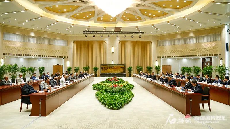 11月1日,自治区党委书记马兴瑞、自治区主席艾尔肯·吐尼亚孜在乌鲁木齐会见来新疆参访的西亚和北非国家宗教界和媒体人士代表团一行。石榴云/新疆日报记者谢龙摄