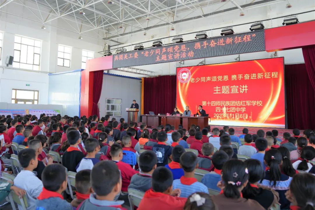 为深入贯彻学习党的二十大精神,深入贯彻落实习近平总书记在北京育英学校考察时的重要讲话精神,深入推进青少年思想政治引领,引导广大青少年从深厚的党史中汲取营养,更好的知党爱党,筑牢信仰之基,砥砺政治品格。11月6日,兵团关工委赴四十七团中学开展“老少同声颂党恩·携手奋进新征程”主题宣讲活动,并举行主题调研会。兵团关工委副主任蔡志恒,四十七团党委副书记、副政委夏明,党委常委、纪委书记肖永疆,党委常委、副政委赵敏,四十七团中学有关领导出席本次活动。