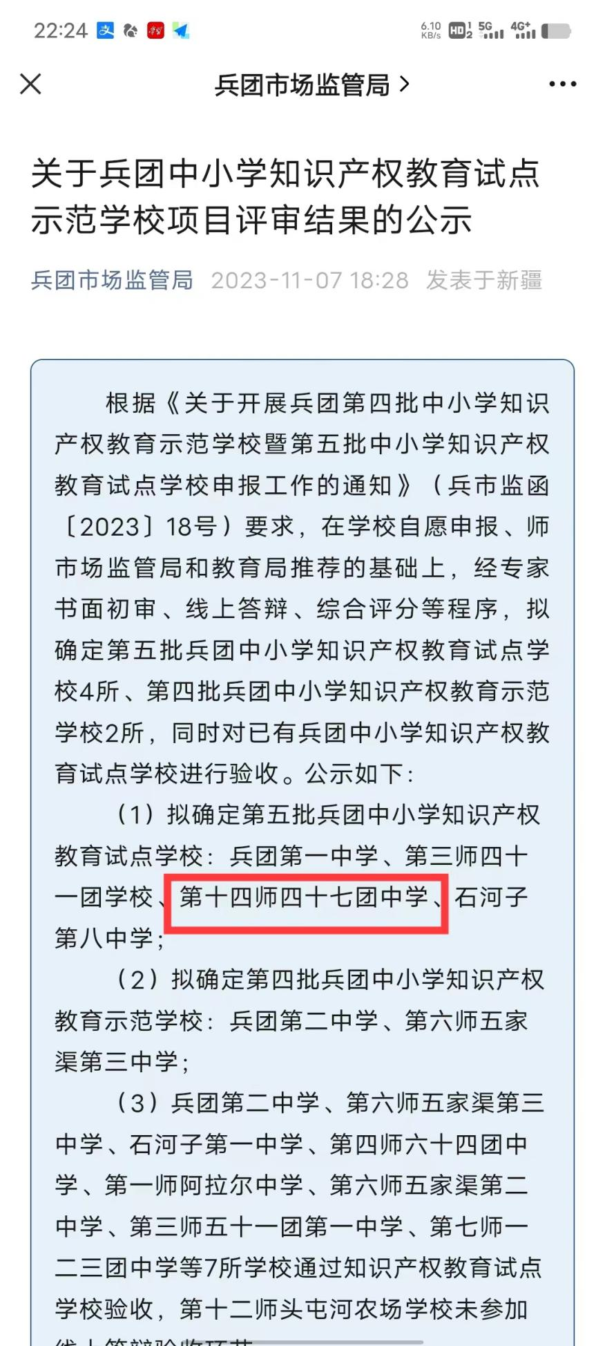 近日,兵团市场监督管理局经专家书面初审、线上答辩、综合评分等程序,确定了第五批兵团中小学知识产权教育试点学校(4个)、第四批兵团中小学知识产权教育示范学校(2个),并进行公示。第十四师四十七团中学成为第十四师昆玉市首个中小学知识产权教育试点学校。